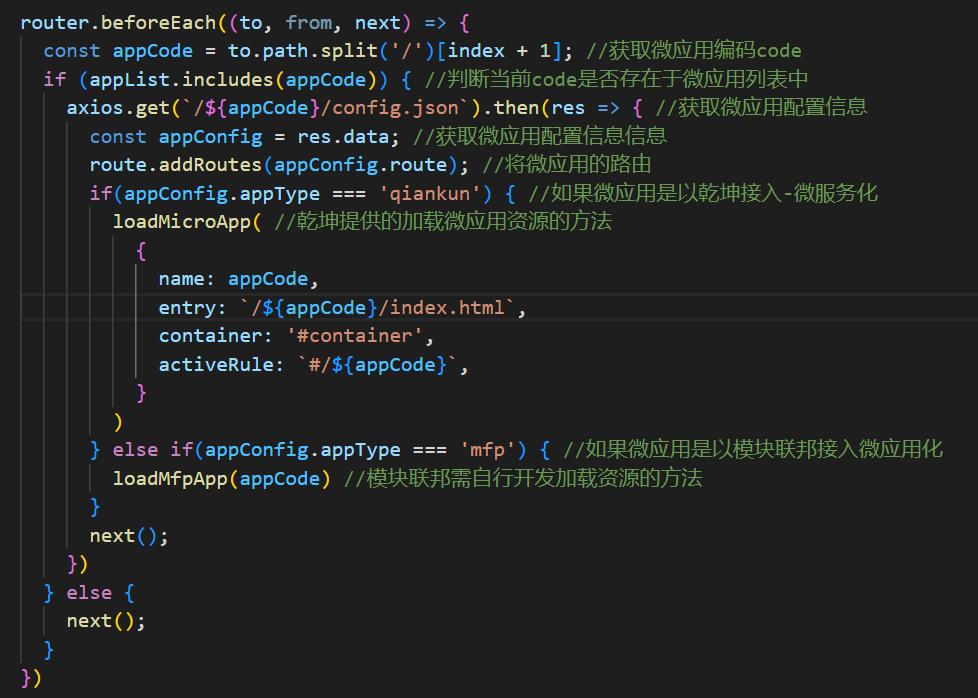 這里需要注意的是,考慮到微應(yīng)用的動態(tài)加載,加載器加載的微應(yīng)用個數(shù)不做限制,如一次性將所有的微應(yīng)用路由全部加載,勢必會造成路由數(shù)據(jù)過于龐大,因此初始化時只注冊中心路由,微應(yīng)用對應(yīng)的頁面路由,則在第一次進入當(dāng)前微應(yīng)用的時候創(chuàng)建。此步驟放在loader加載器中實現(xiàn)。