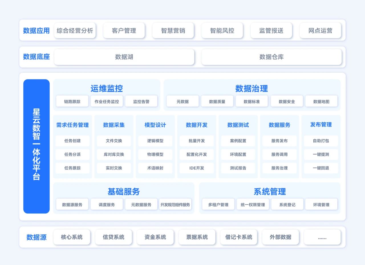 針對(duì)上述這些痛點(diǎn),長(zhǎng)亮科技為數(shù)據(jù)類(lèi)項(xiàng)目實(shí)施團(tuán)隊(duì)著手打造了“星云數(shù)智一體化平臺(tái)”。作為面向數(shù)據(jù)運(yùn)營(yíng)的一體化平臺(tái),其設(shè)計(jì)方向主要是滿(mǎn)足數(shù)據(jù)倉(cāng)庫(kù)和數(shù)據(jù)湖的數(shù)據(jù)加工需求,為應(yīng)用系統(tǒng)提供加工好的數(shù)據(jù)。并結(jié)合DataOps數(shù)據(jù)運(yùn)營(yíng)方法論,實(shí)現(xiàn)數(shù)據(jù)資產(chǎn)的加工、建模和對(duì)外服務(wù)供給。對(duì)數(shù)據(jù)開(kāi)發(fā)而言,星云平臺(tái)可以有效降低管理成本,促進(jìn)規(guī)范統(tǒng)一和落地,提高開(kāi)發(fā)效率和質(zhì)量。