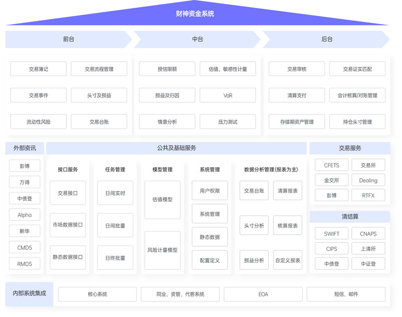 為金融機構資金業務條線打造專業的、最大化自主可控的資金前中后一體化資產信息系統,提供從前臺交易,中臺風險,到后臺清算核算、報表統計等各項功能。