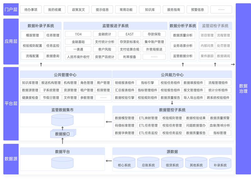 集成了全部主流監管機構要求報送的監管模塊,可幫助銀行及時、準確、完整、高效的做好數據報送工作,快速響應金融監管機構的要求,提供 “一站式”監管報送服務。報送模塊覆蓋非現場監管(1104)、金融統計大集中系統、一表通、銀保監數據標準化規范(EAST5.0)、利率報備監測分析系統、存款保險信息系統、金融基礎數據報送系統、支付信息統計分析系統(PISA)、存貸款標準化、支付結算合規、客戶風險管理系統、集中銀行賬戶管理系統、外管局報送系統等。
