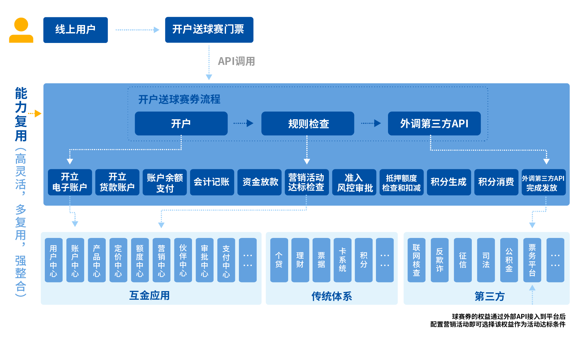 以開戶送球賽門票為例:通過流程編排服務,組合賬戶中心的開立電子賬號的API接口、營銷中心的營銷活動達標檢查接口、票務平臺的第三方API接口這三個服務,共同實現開戶送球賽門票的場景。