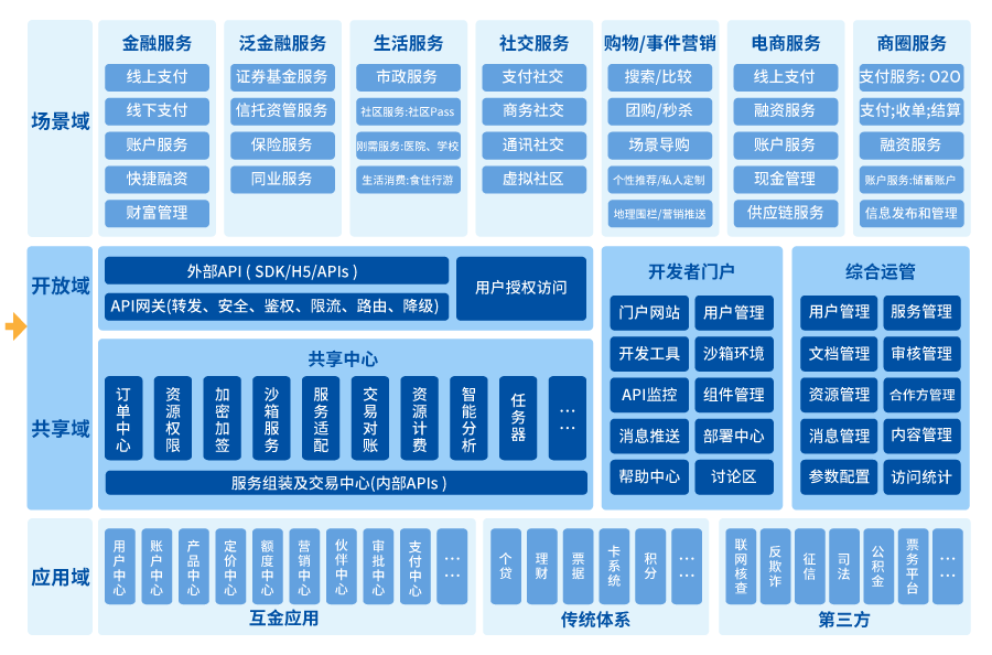 長亮科技開放平臺通過共享域來整合應用的金融能力,通過開放域來將金融能力輸出給場景方。