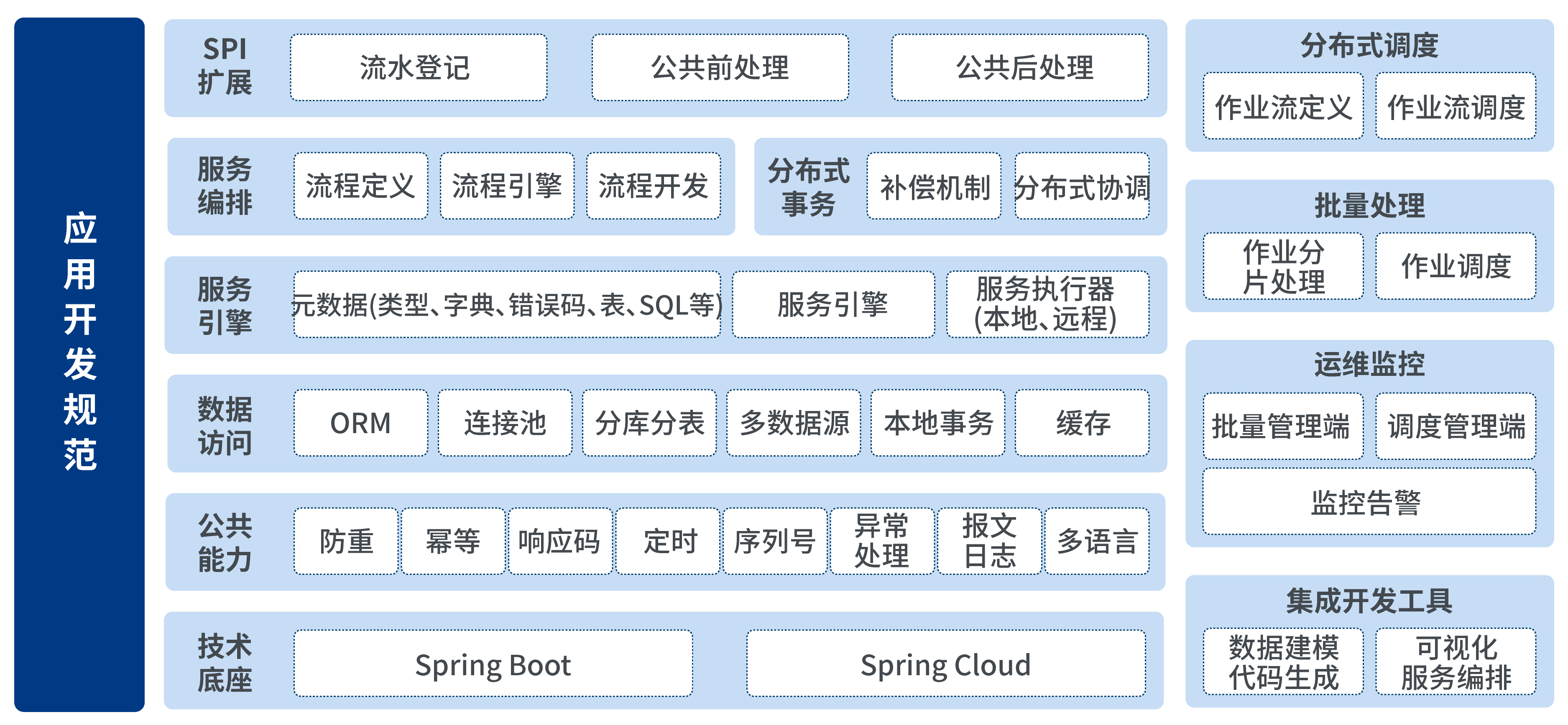 新一代金融應(yīng)用平臺(tái)總體架構(gòu)由聯(lián)機(jī)引擎(服務(wù)引擎、服務(wù)編排、分布式事務(wù)、元數(shù)據(jù)等)、批量引擎(分布式調(diào)度、批量處理)、公共能力(防重、冪等、序列號(hào)、數(shù)據(jù)訪(fǎng)問(wèn)、SPI機(jī)制、技術(shù)底座等)、開(kāi)發(fā)工具和開(kāi)發(fā)規(guī)范組成。