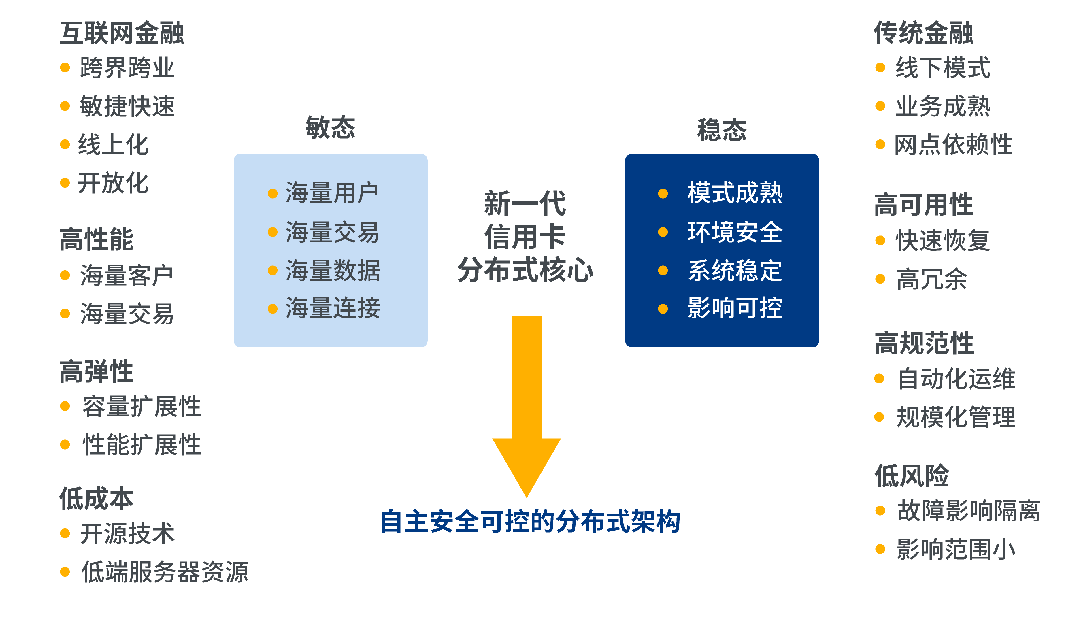 更重要的是,基于國內外大環境來看,銀行作為國家經濟命脈的支柱行業,其自主可控的基本定位已經上升到國家安全的戰略高度。以安全保發展,以創新促發展,借助我國自主研發的軟硬件技術,替代舶來的國外產品,打破潛在的戰略安全隱患,是國家的必然選擇、銀行IT系統建設的必然趨勢,也是信用卡核心系統發展的必由之路。