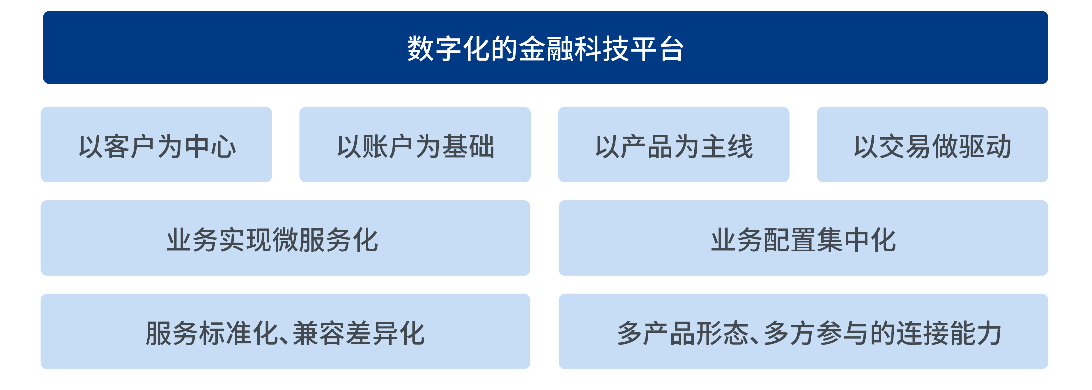 基于微服務化的基本思想,建立各種彼此獨立又互相協作的能力中心,包括產品中心、定價中心、額度中心、授權中心、賬務中心等,以此為依托進行產品創新和業務的集中運營。并通過標準且兼容的服務接口,提供對外的開發能力,連接相關參與方共同享受金融科技的紅利。
