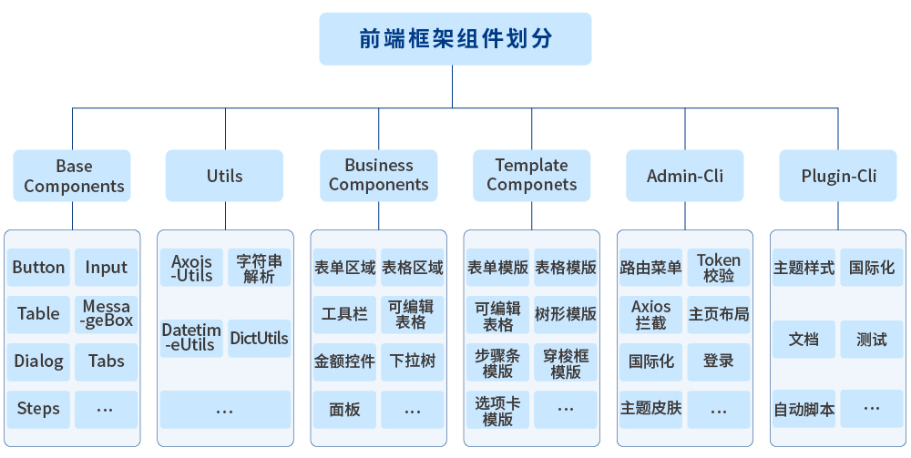 按組件分類,前端框架分為了6大模塊。每個模塊作為獨立的工程發(fā)布為插件,模塊本身可以存在依賴關(guān)系,如:工具類和基礎(chǔ)組件,作為最小的模塊,為其他模塊提供支持,其他模塊的功能,基于這兩個模塊開發(fā)。
