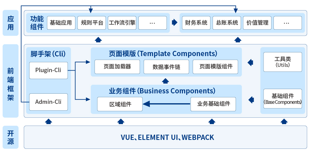 如上圖所示,前端框架基于VUE + Element UI等開源技術(shù)為底座,以減輕開發(fā)人員的學習成本,而前端框架支持整個應(yīng)用系統(tǒng)功能的開發(fā)。