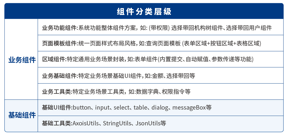企業(yè)內(nèi)部要實現(xiàn)組件化開發(fā),可以根據(jù)自身業(yè)務(wù)實際情況,首先明確好“組件”的定義,達成共識。可將組件歸為兩大類,基礎(chǔ)組件和業(yè)務(wù)組件,如下所示。