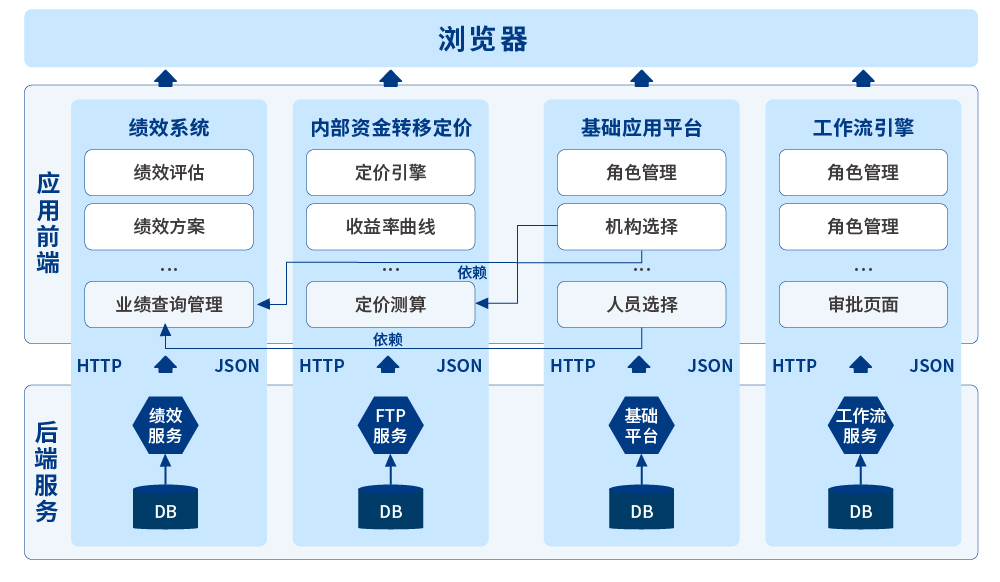 上圖中表明,基礎(chǔ)應(yīng)用平臺的“機構(gòu)選擇”和“人員選擇”功能,可以作為公共功能抽取出組件,發(fā)布到私服,由“績效系統(tǒng)”“內(nèi)部資金轉(zhuǎn)移定價”等系統(tǒng)使用。 績效系統(tǒng)中的“業(yè)務(wù)查詢管理”依賴“基礎(chǔ)應(yīng)用平臺”的功能完成,內(nèi)部資金轉(zhuǎn)移定價中的“定價測算”也是依賴“基礎(chǔ)應(yīng)用平臺”功能。