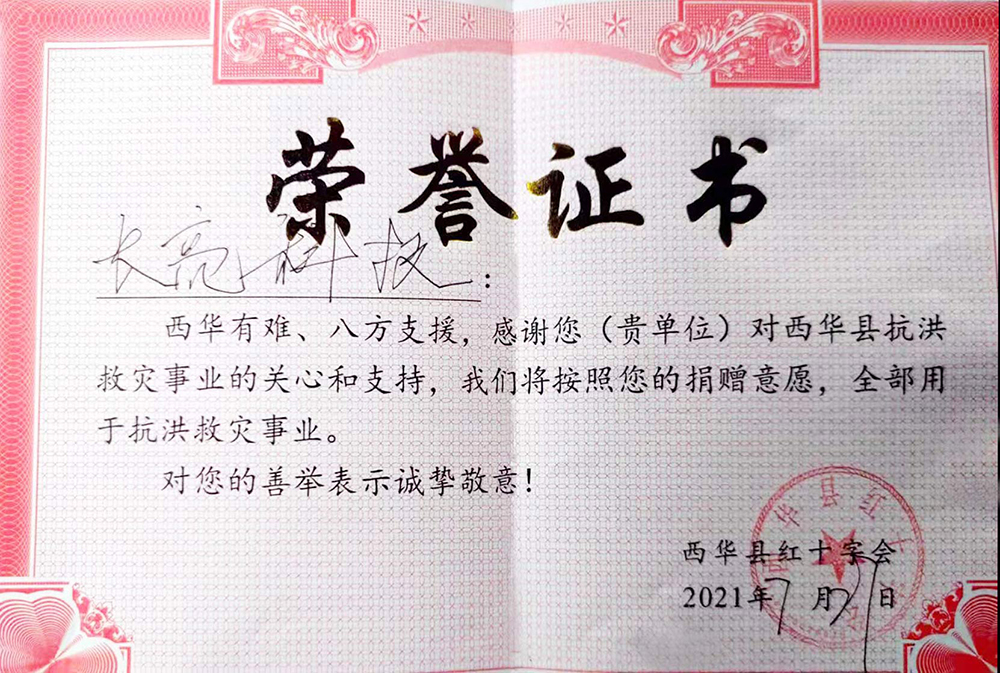 在物資最緊缺的時候,我們募捐的防洪物資已及時送至同胞手中,為他們渡過難關送去了一份力量和溫暖,贈人玫瑰,手有余香!救災物資到達后,我們也收到了很多來自災區人民的反饋和感謝,西華縣委辦公室主任反饋“雨鞋和雨衣在一線非常實用,物資非常及時”,西華縣紅十字會也為長亮科技頒發了榮譽證書,這份感謝屬于我們每一位獻出愛心的長亮人!
