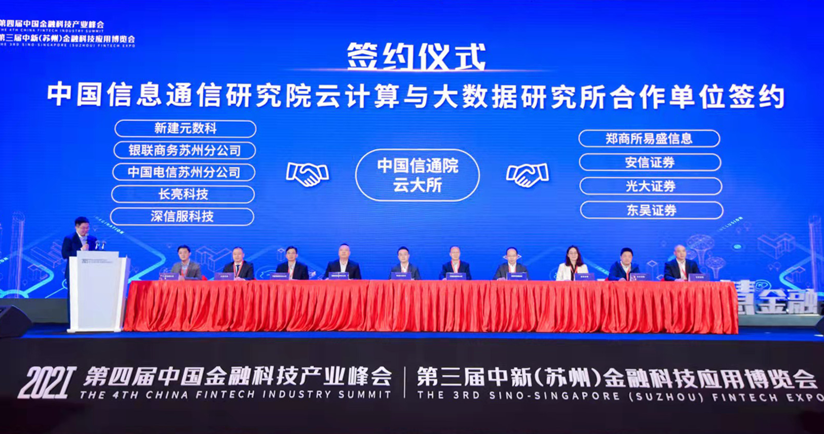 2021年10月28日至30日,第四屆中國金融科技產業峰會暨第三屆中新(蘇州)金融科技應用博覽會在蘇州舉辦。會上,長亮科技成為中國信息通信研究院云計算與大數據研究所(簡稱:中國信通院云大所)的合作單位之一,長亮科技總裁助理孫世勝、中國信通院云大所所長何寶宏代表雙方簽署業務合作協議。